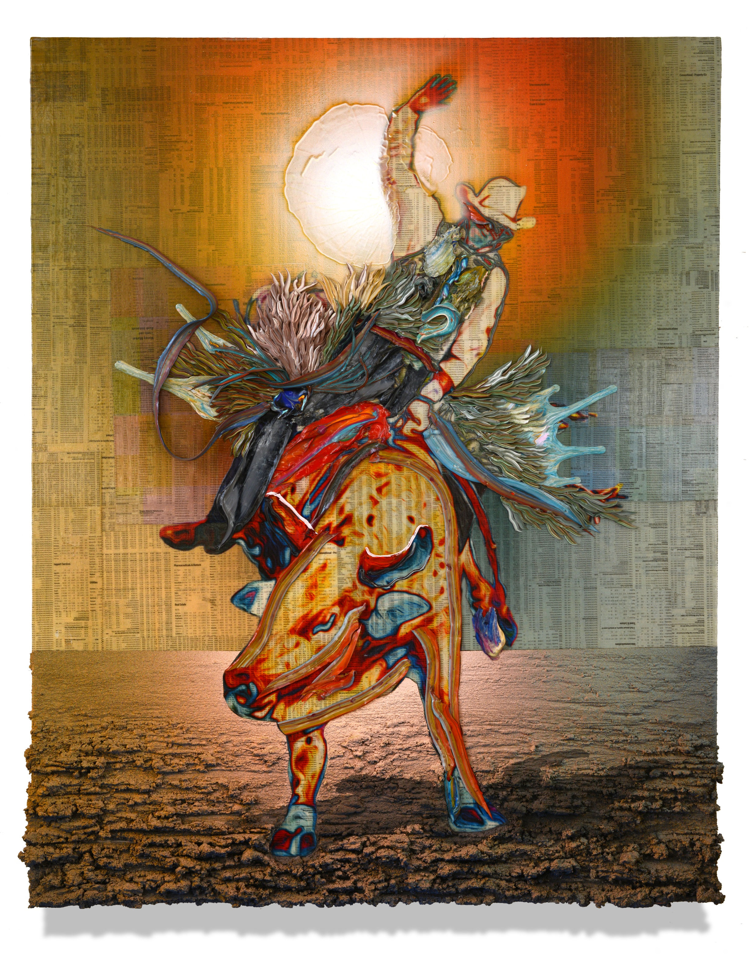 Financial newspaper, archival inkjet, acrylic and sand on canvas