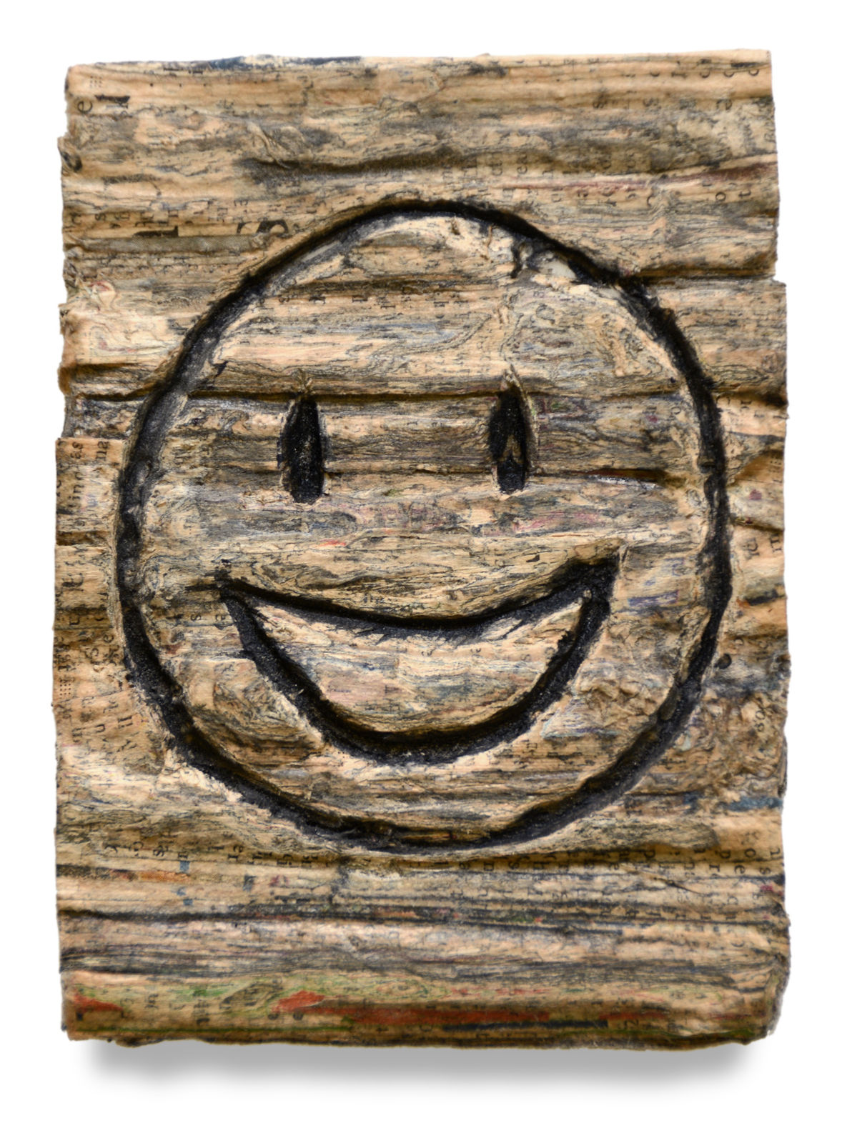 Metaphorically the sanded and layered surfaces of the financial newspapers refers to the global information space where instantaneous transmissions of trillions of capital carves out Utopias and Dystopias. Here it is materialised into fragments of faux driftwood from a sea of data, eroded by a meteorology of information and carved with 'fun' emojis; a human mark of existence against an unthinkably complex techno-sublime landscape.